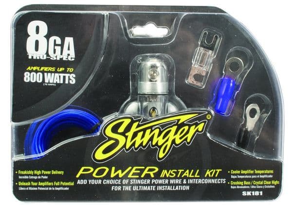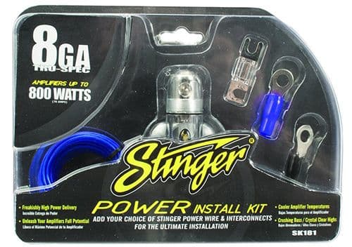 8GUAGE Install kit with MIDI Fuse Holder Designed specifically for car audio systems up to 1000 Watts or 100 Amps SPD5801 water proof Mini-ANL (MIDI) fuse holder 100 Amp Shoc-Krome Mini-ANL(MIDI) fuse 17ft. Matte blue 18ga remote turn-on wire 4ga crimp ring terminals Blue, red, black boots to match power wire 18ga fork terminal 16ga blue butt connector 4ga snap in protective firewall grommet Self drilling mounting screws (10) 7” wire ties